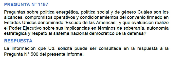 La respuesta oficial es una triple remisión —a las preguntas 180, 1780 y 548— sin aporte sustantivo. La fórmula central, contenida en la respuesta a la Pregunta N° 1080, es: “La Oficina Nacional de Contrataciones informa que no se registran contrataciones de ‘+BE’ con el Estado Nacional”. La precisión es relevante: la afirmación se limita al Estado Nacional. National Shipping S.A. no integra el universo del Estado, pero sí mantiene contratos con YPF, controlada por el Estado. Esa distinción —entre el Estado Nacional estricto y las empresas con participación estatal— es la que la respuesta oficial elude.