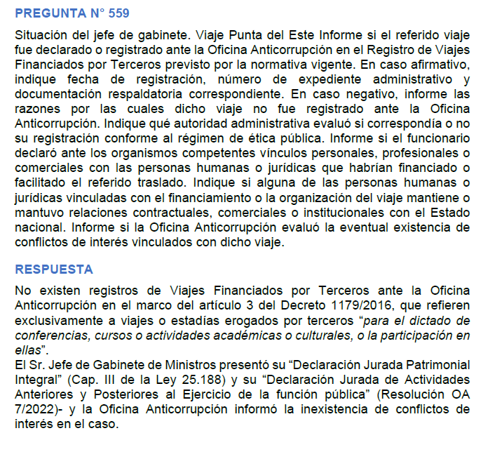 Ante la Pregunta N° 559, que solicitaba saber si el viaje fue declarado en el Registro de Viajes Financiados por Terceros, el Gobierno respondió que no existe obligación de registrarlo. El argumento es que el Decreto 1179/2016 limita ese registro a traslados financiados por terceros “para el dictado de conferencias, cursos o actividades académicas o culturales”. La respuesta agrega que Adorni presentó su declaración jurada patrimonial integral y que la Oficina Anticorrupción (OA) informó “la inexistencia de conflictos de interés en el caso”.