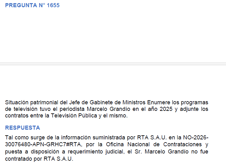 La Pregunta N° 1655 solicitaba la lista de programas que Grandio tuvo en la TV Pública en 2025 y los contratos correspondientes. La respuesta del Gobierno es directa: “El Sr. Marcelo Grandío no fue contratado por RTA S.A.U.”, con respaldo en información suministrada por la propia empresa y puesta a disposición de la Justicia.