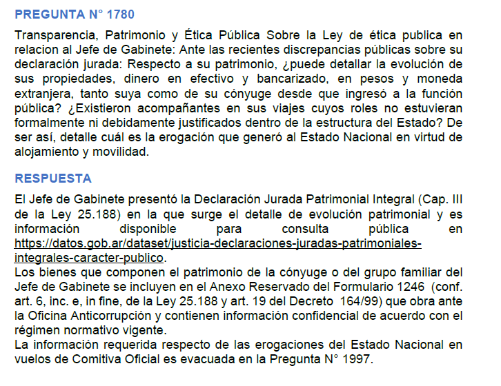 La Pregunta N° 1780 pedía el detalle de la evolución patrimonial de Adorni y su cónyuge desde el inicio de la función pública, y si existieron acompañantes en viajes oficiales cuyos roles no estuvieran justificados dentro del Estado. La respuesta remite a la declaración jurada disponible en el portal datos.gob.ar, señala que los bienes de la cónyuge están en el Anexo Reservado del Formulario 1246 —de carácter confidencial— y deriva la pregunta sobre erogaciones de comitiva a la Pregunta N° 1997.