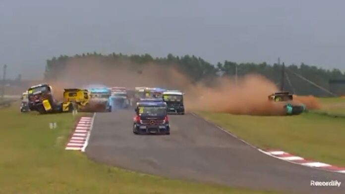 La segunda carrera del día comenzó con una largada intensa. Los camiones de Danilo Alamini, Paulo Salustiano, Felipe Tozzo y Leandro Totti se vieron implicados en una colisión que llevó al camión número 55, conducido por Salustiano, a volcar. Las imágenes del accidente comenzaron a circular rápidamente en redes sociales, mostrando el impacto y el momento en que el vehículo quedó apoyado lateralmente sobre el asfalto.