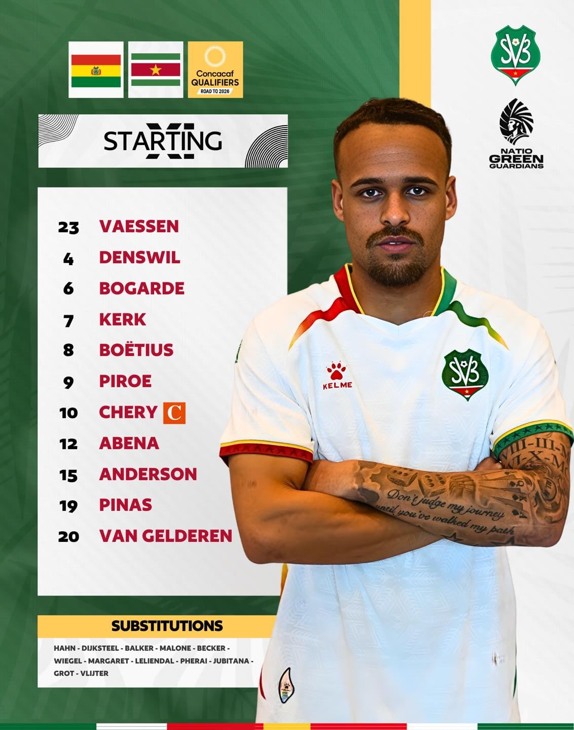 Surinam: Etienne Vaessen; Liam van Gelderen, Myenty Abena, Melayro Bogarde, Shaquille Pinas; Dion Malone, Kenneth Paal, Denzel Jubitana; Gyrano Kerk, Sheraldo Becker y Joël Piroe. DT: Henk ten Cate.